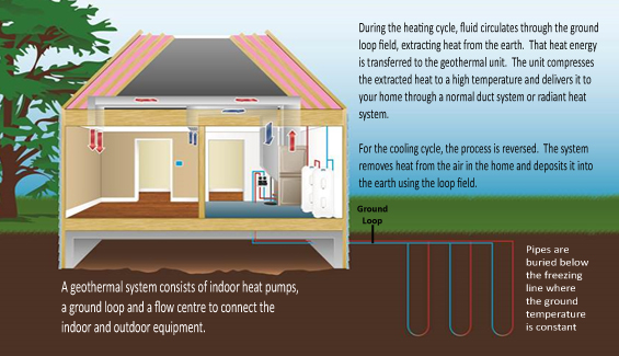 The temperature of the Earth’s core is over 4,000 degrees Celsius, with the inner heat radiating outward from the core and heat from the Sun radiating inward from the Earth’s surface. In the province of Ontario, the Earth’s temperature stays constant in the top 200 meters of the crust, ranging from 6-11 degrees Celsius depending on the region’s seasonal temperature. Geothermal HVAC systems utilize energy extracted from the Earth and is able to dependably distribute heating and cooling no matter what the climate as the energy extracted remains at a constant temperature throughout the year.
