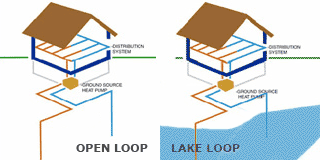 An open loop system pumps water from a body of water (well, pond or lake) and returns it to surface water or an injection well.