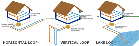 A closed loop system utilizes a grid of pipes to pump heat transfer fluid through either a horizontal or vertical circuit of underground piping between the ground and the building.
